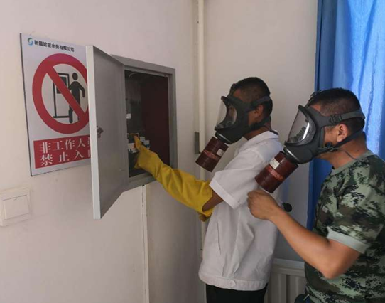 演練中,值班人員發(fā)現(xiàn)危險(xiǎn)化學(xué)品泄漏后馬上報(bào)告給部門(mén)領(lǐng)導(dǎo),并立即啟動(dòng)哈密水務(wù)公司二氧化氯泄漏應(yīng)急處置預(yù)案,迅速組織人員按照預(yù)案處置程序采取措施:公司維修人員根據(jù)指令全部穿戴好防毒護(hù)具,做好停電措施并關(guān)閉加藥設(shè)備、開(kāi)啟通風(fēng)設(shè)施進(jìn)行搶修,同時(shí)對(duì)泄漏地面的藥品進(jìn)行稀釋沖洗,整個(gè)處置過(guò)程緊密配合、銜接有序。