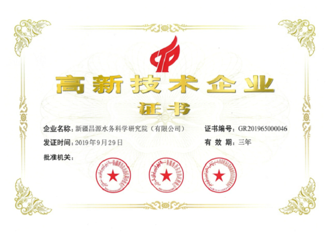 2019年9月29日,新疆昌源水務科學研究院順利通過高新技術企業(yè)認定(2019年12月19日取得證書),獲得自治區(qū)科技廳、財政廳和稅務局聯合頒發(fā)的“高新技術企業(yè)證書”。