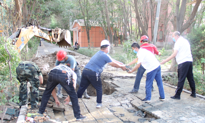由于破損點為DN80二級管網(wǎng)鋼管,且位于人行道,施工面積小,挖掘機械無法進入,只能采取以人工施工為主、機械輔輔助施工的方式搶修,搶修人員的工作量大大增加。供水搶修人員沒有絲毫退卻,冒著40度的高溫,采取人工加機械的方式進行搶修,排水、挖泥、修補漏損點。為節(jié)省時間提高效率,哈密水務(wù)組織多班人員輪番上陣, 在泥水里連續(xù)作戰(zhàn)。 經(jīng)過2個多小時的緊張工作,破損管網(wǎng)成功修復(fù)并恢復(fù)正常供水。